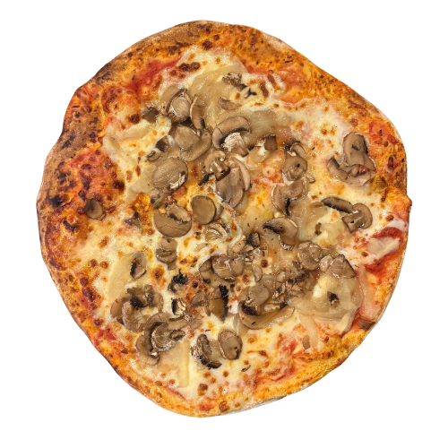 Pomodoro italiano, mozzarella fresca en juliana, champiñón paris y cebolla caramelizada. Diametro 28 cm